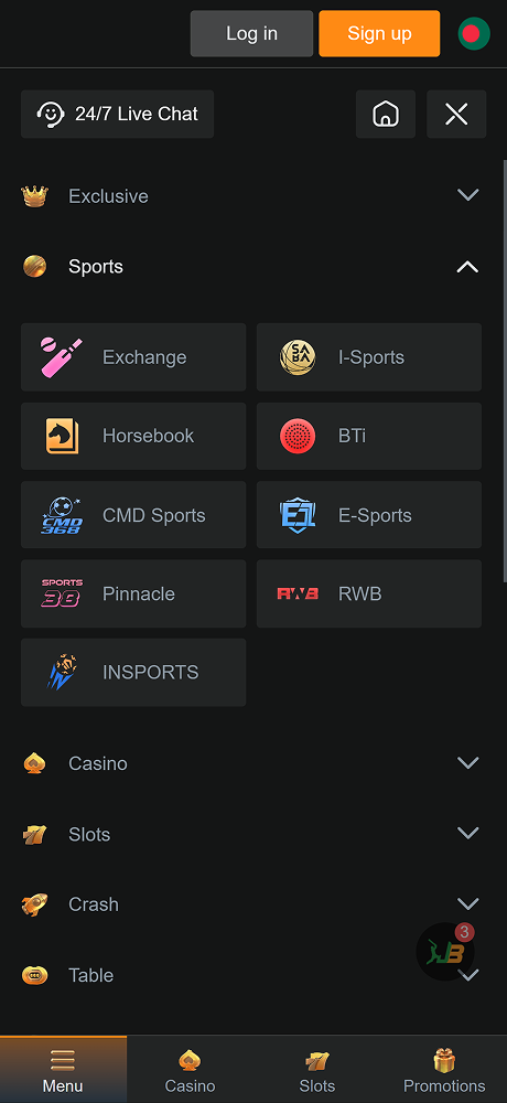 - খেলাধুলা বা অনলাইন ক্যাসিনো বিভাগে নেভিগেট করুন;