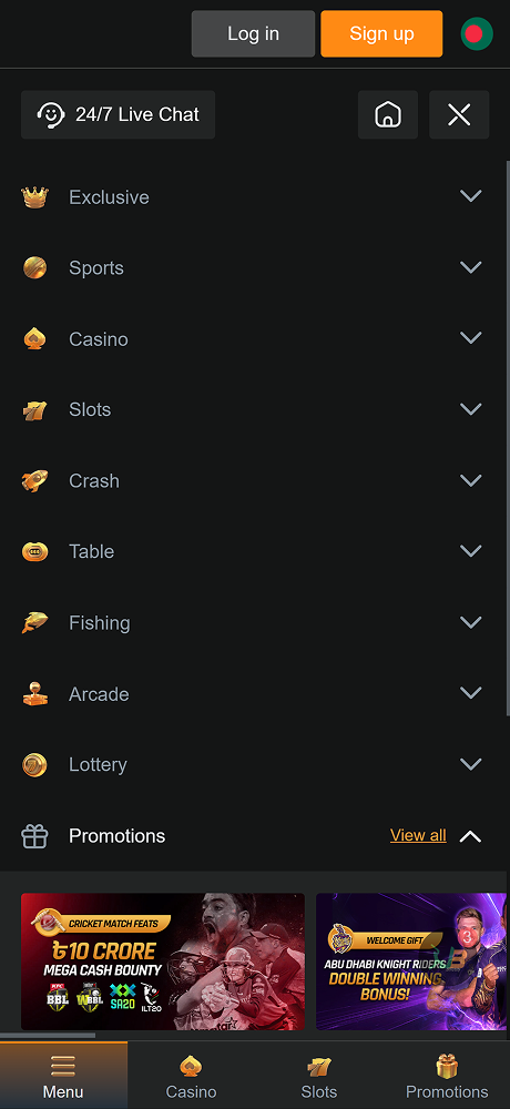 | প্রধান বিভাগ | খেলাধুলা, ক্যাসিনো, স্লট, টেবিল, ফিশিং, আর্কেড, লটারি, প্রচার, ভিআইপি |